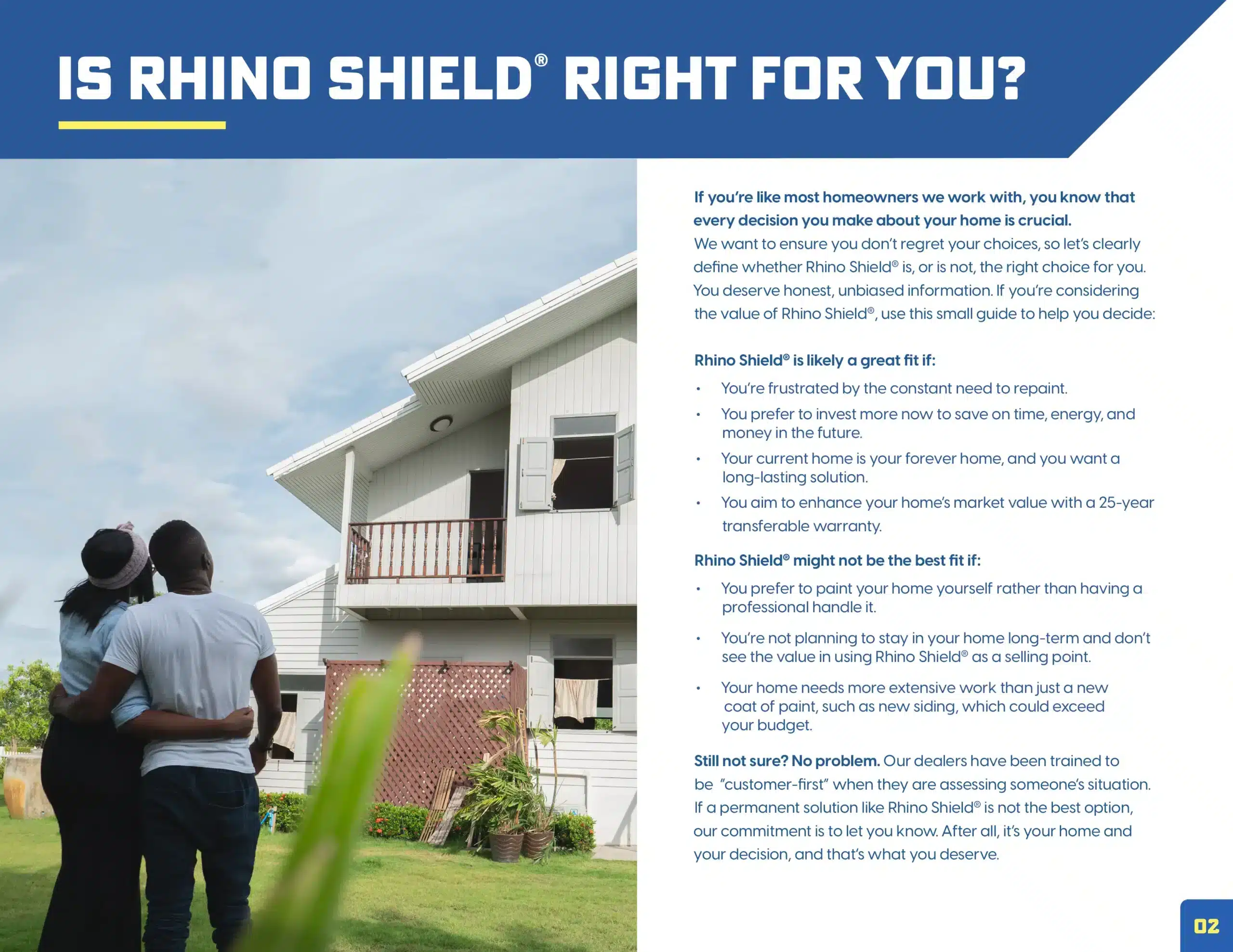 We don’t cut corners. Our goal is to give you a long-lasting solution that frees you from the hassle of constant maintenance and repainting. With RhinoShield, you get a stunning exterior that’s built to last, backed by a 25-year warranty for peace of mind.